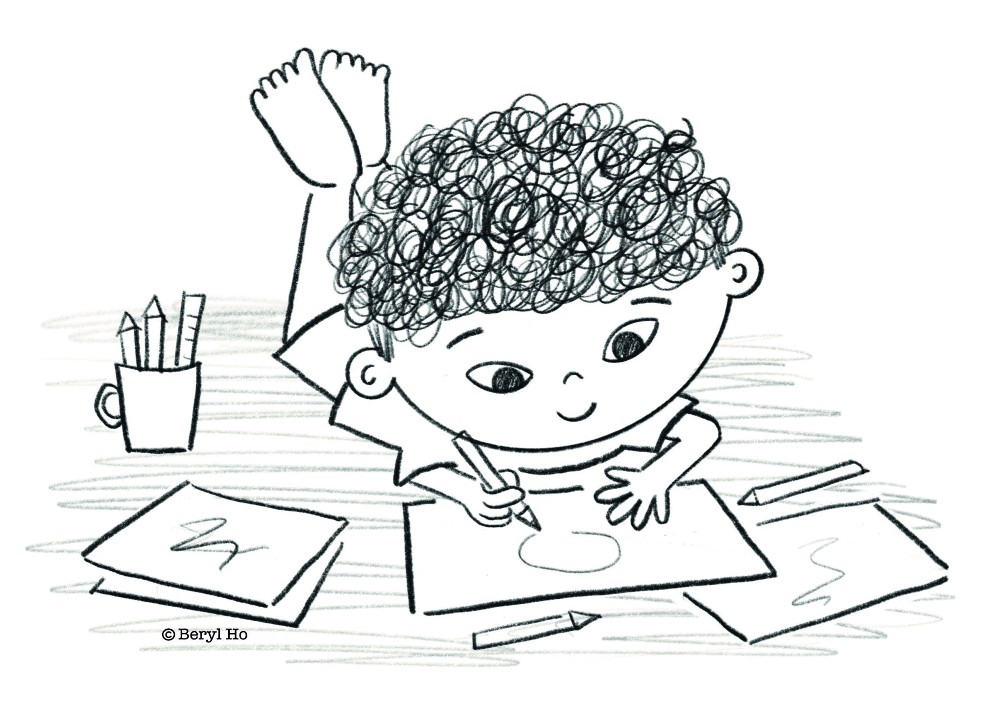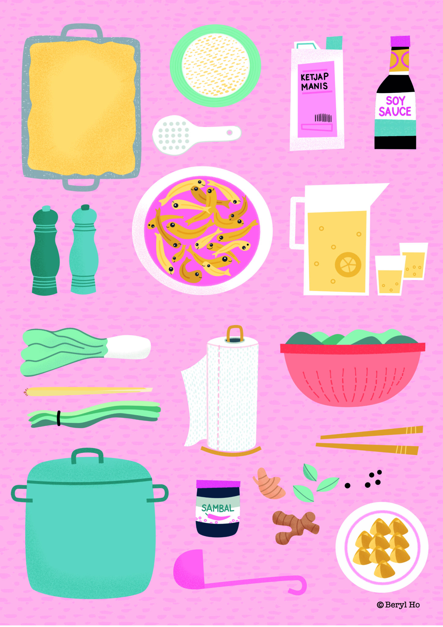 Beryl starts each illustration with pencil, then digitally refines it using Procreate and Affinity Designer—always fueled by a good cup of coffee and sometimes a bit of chocolate.